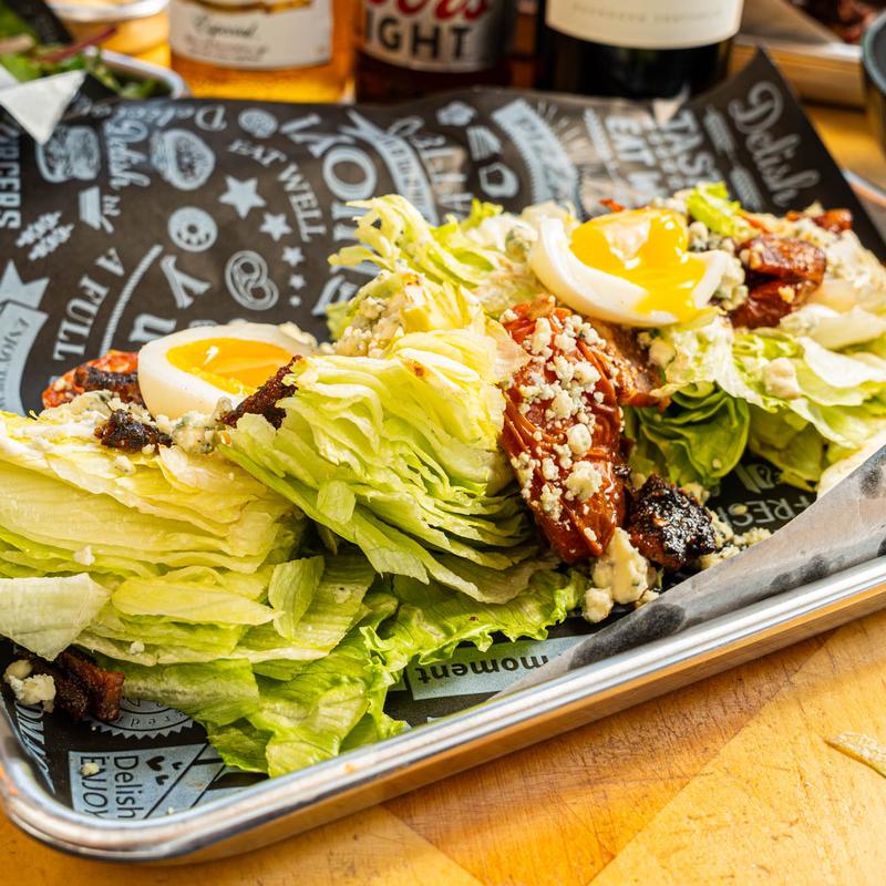 Wedge of iceberg with roasted tomatoes, candied bacon, bleu cheese crumble, soft-boiled egg, and bleu cheese dressing • Add Salmon +$7.00 | Shrimp +$6.00 | Chicken +$5.00 | Steak +$7.00 | Pork Belly +$8.00