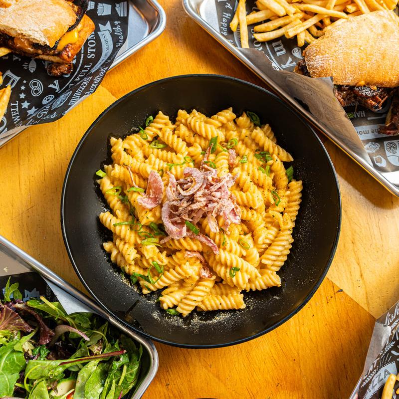 Creamy Mac and Cheese topped with Garlic Herb Crumb and Fried Onions • Add Salmon* +$7.00 | Shrimp* +$6.00 | Chicken* +$5.00 | Steak* +$7.00 | Pork Belly* +$8.00