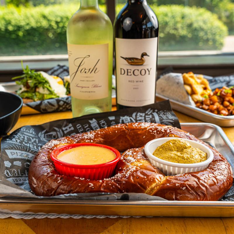 A giant Bavarian pretzel served with a beer cheese sauce and spicy mustard.