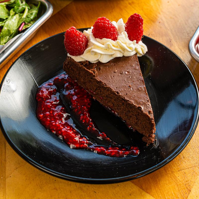 Flourless chocolate cake with raspberry coulis and vanilla whipped cream.